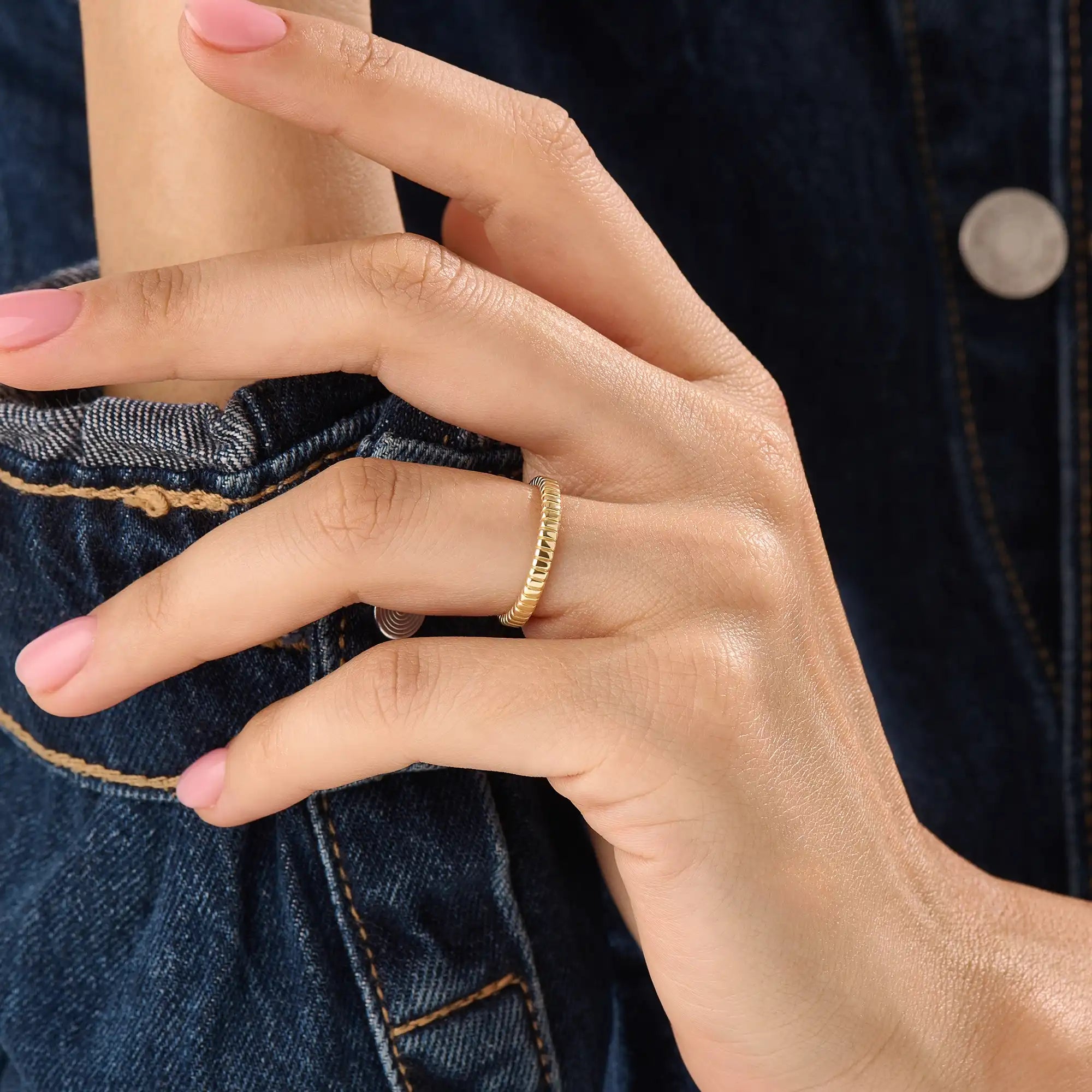 This 14k Gold Vermeil Minimalist Band Ring features a clean, structured pattern that adds depth without overpowering. Its polished finish and slim design make it perfect for everyday wear. Elegant when stacked or worn alone, this piece embodies simplicity, balance, and golden sophistication.