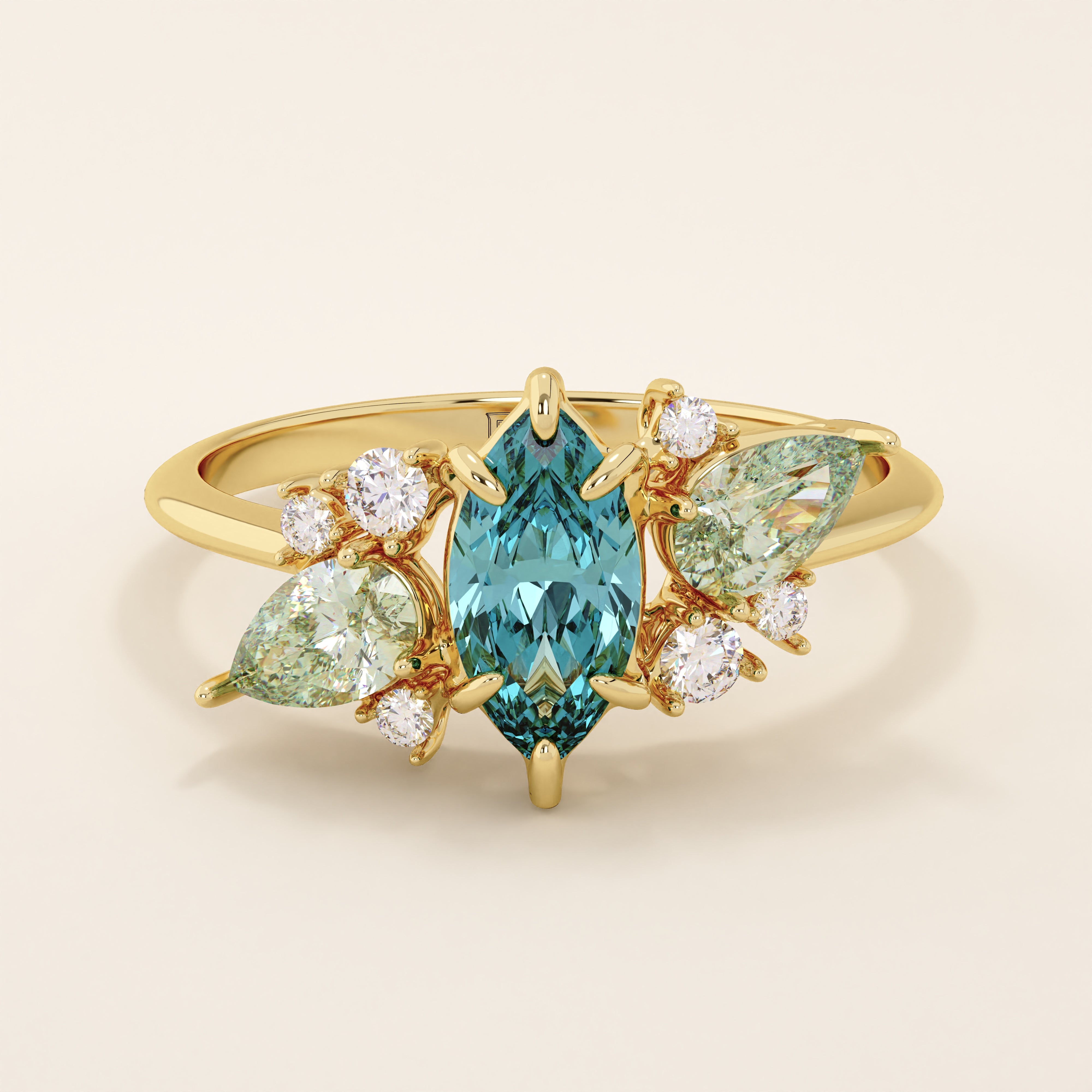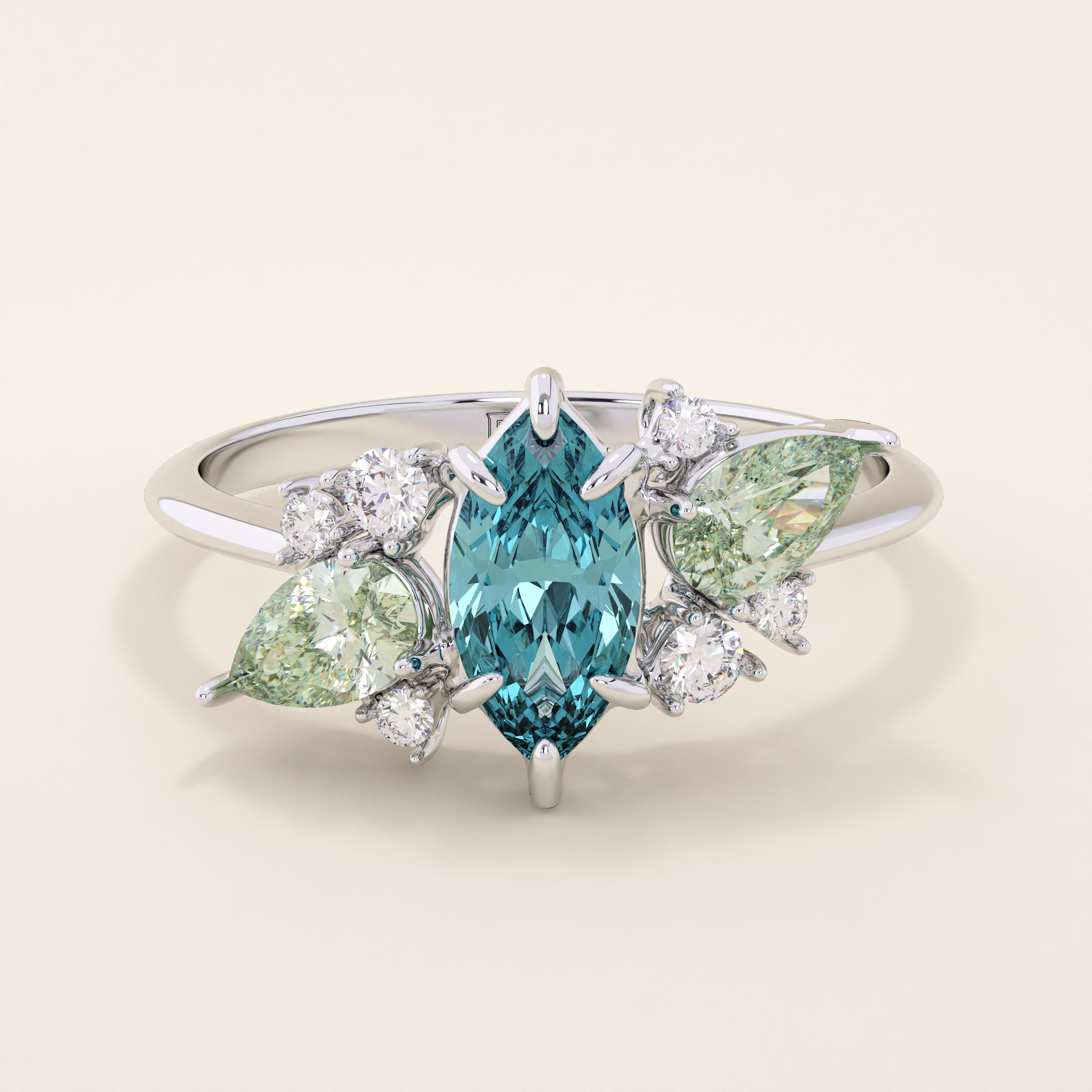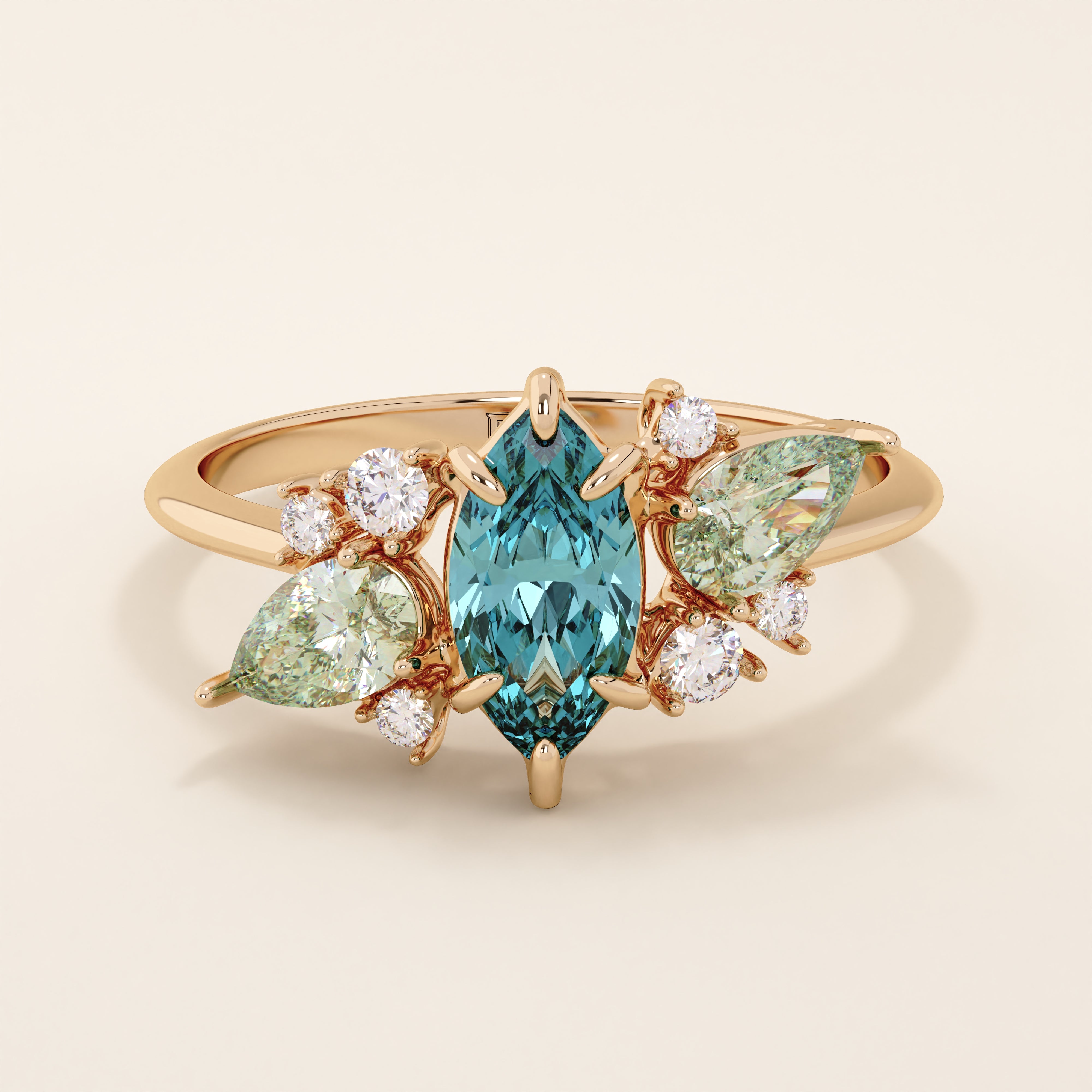 This Blue Topaz Engagement Ring showcases a stunning blue topaz centerpiece, complemented by vibrant olive sapphires and lab-grown diamonds. Expertly crafted, it combines the unique hues of the olive sapphires with the brilliant sparkle of sustainable lab diamonds, offering a refined and elegant choice for a meaningful commitment.
