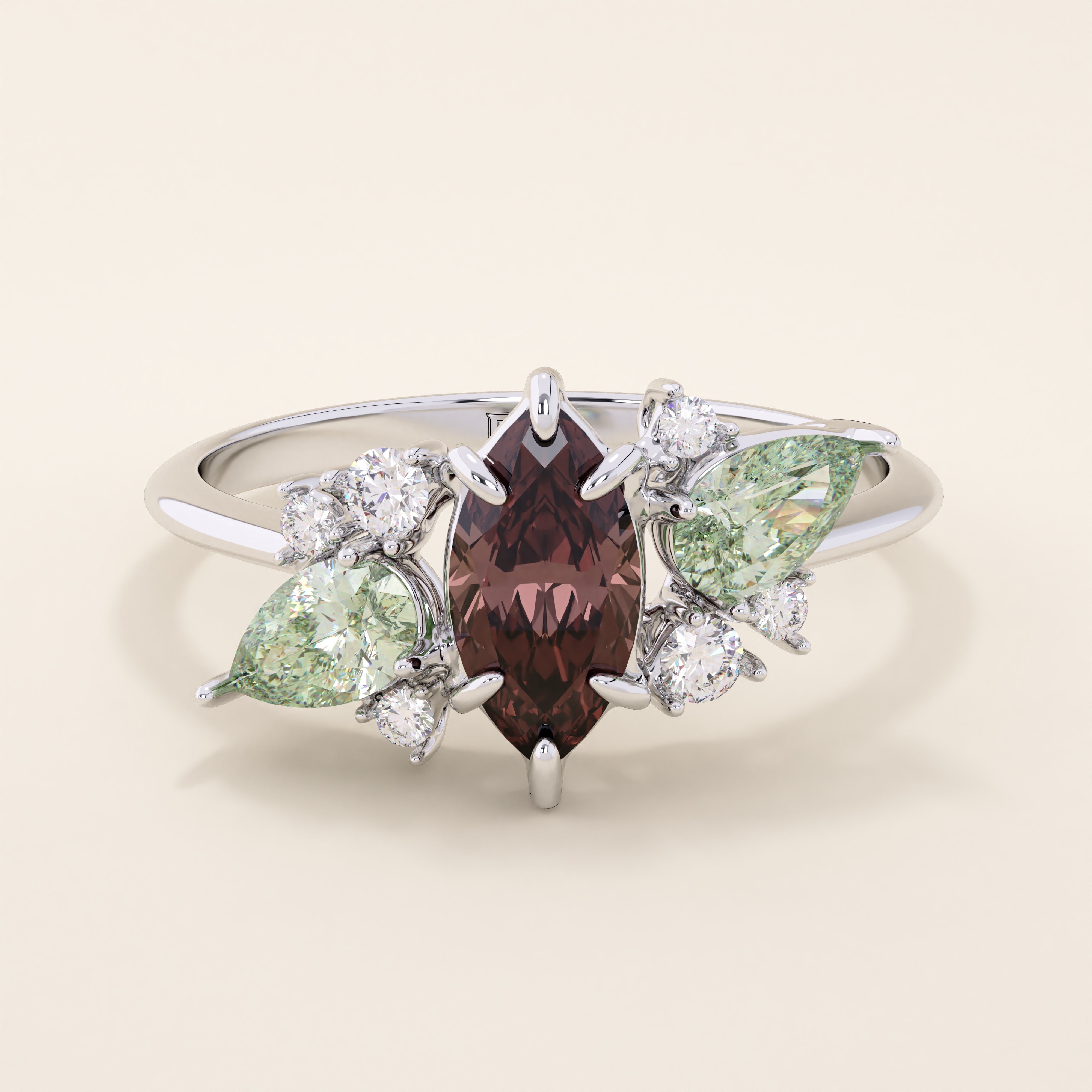 This marquise cut Color Change Engagement Ring features exquisite olive sapphires that subtly shift in hue, paired with brilliant lab-grown diamonds to enhance its unique appeal. The elegant marquise shape offers a timeless silhouette, while the color-changing sapphires provide a distinctive, dynamic element that adapts to different lighting.