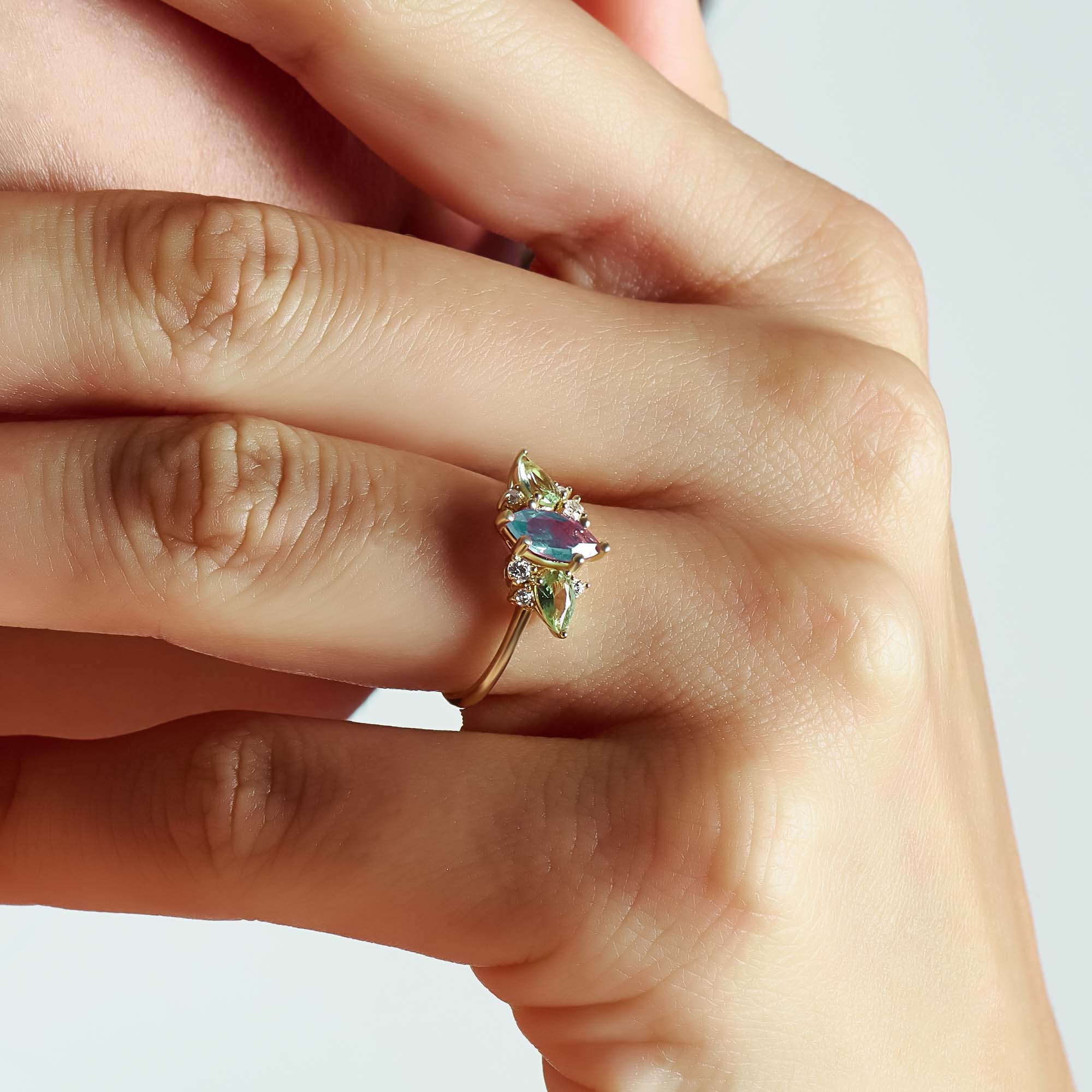 - Side stones: Lab-Grown Olive Green Sapphire - 5x3 Pear cut