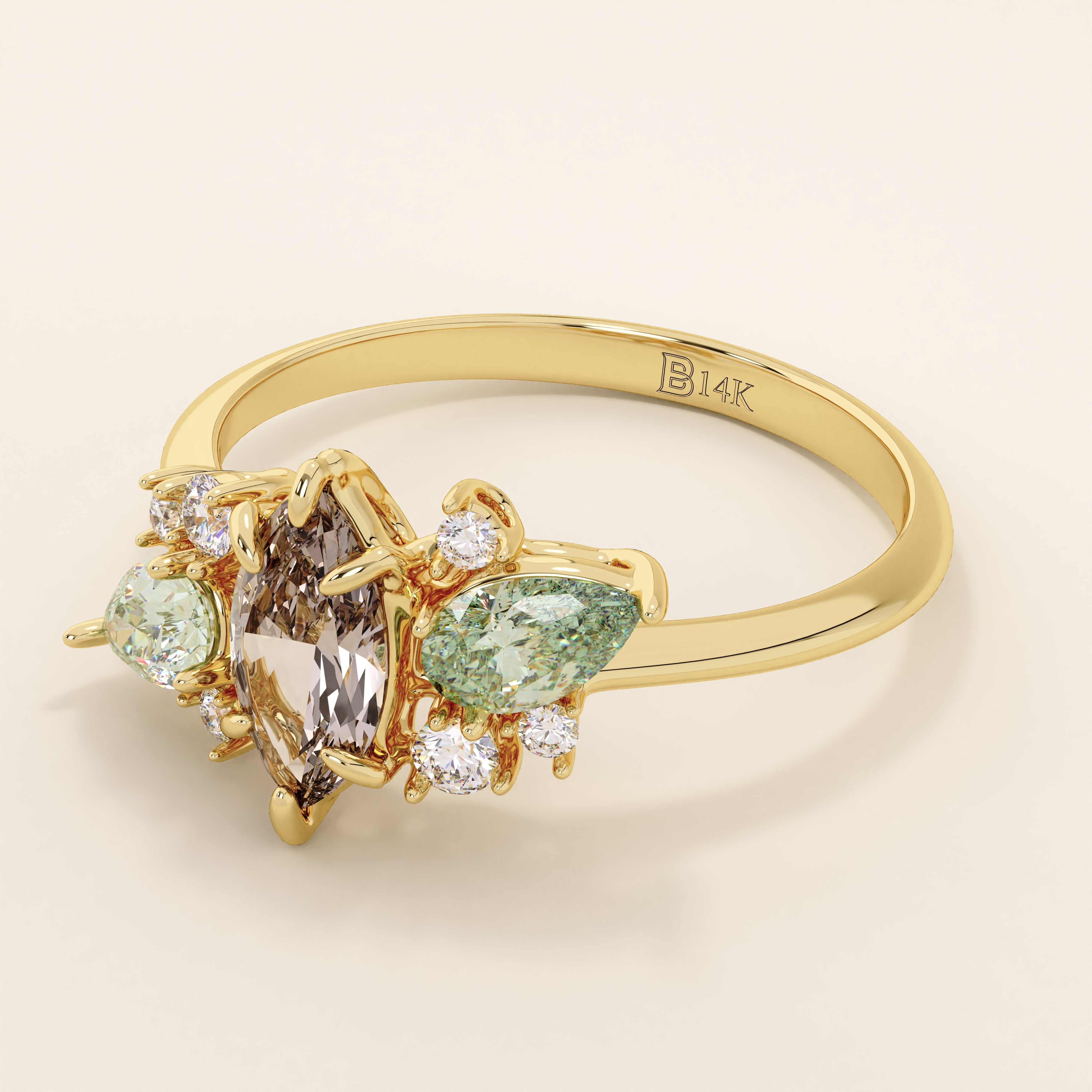 This Smoky Grey Engagement Ring features a unique olive green sapphire as its centerpiece, surrounded by sparkling lab-grown diamonds for enhanced brilliance. The muted grey band offers a modern yet timeless appeal, complementing the distinctive green hue of the sapphire. Crafted with precision, this ring balances elegance and individuality, making it a sophisticated choice for a meaningful engagement.