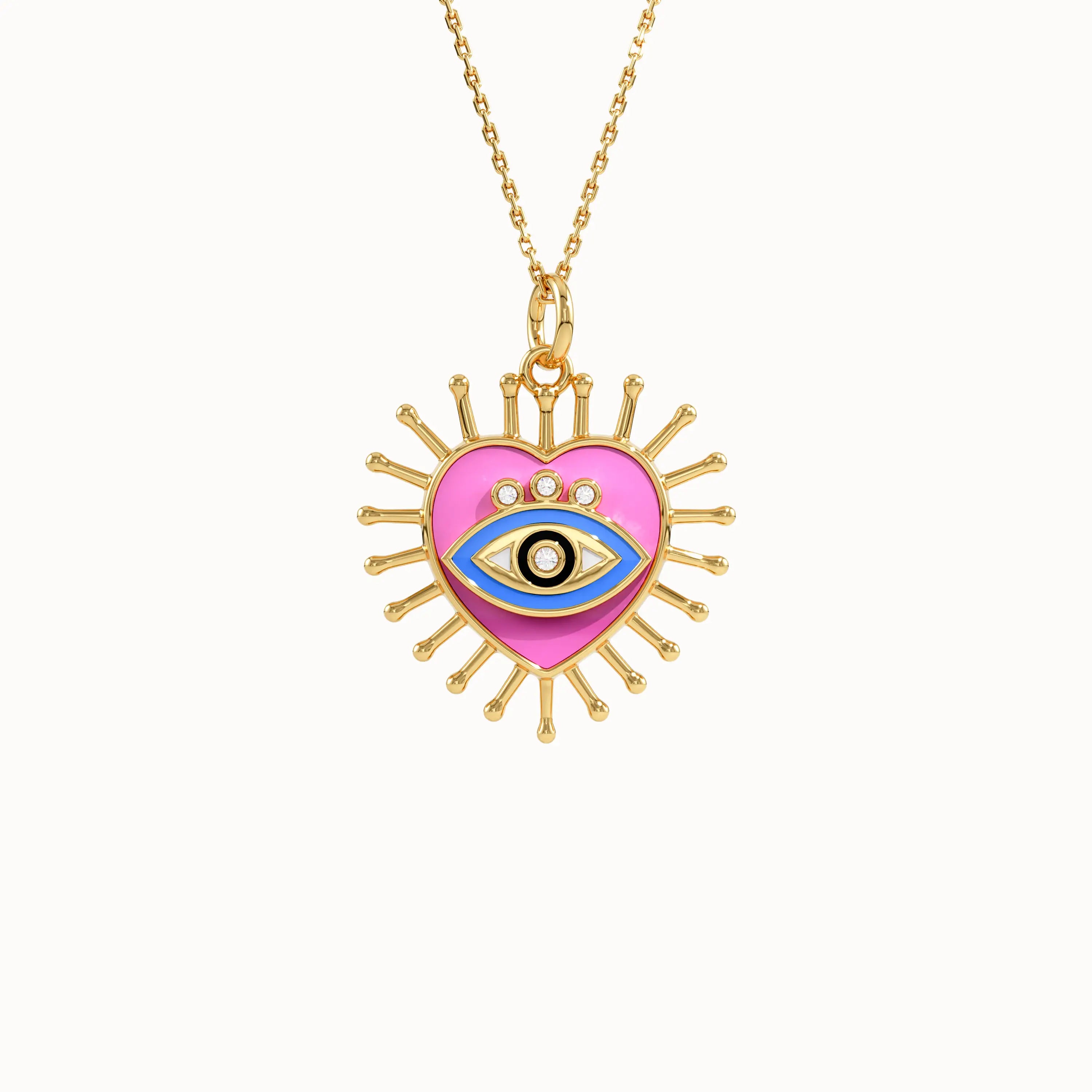 This 14K solid gold necklace features a beautifully detailed pink and blue enamel evil eye heart pendant. Crafted with the highest quality materials, this necklace offers both style and protection. Make a statement and ward off negative energy with this unique piece.