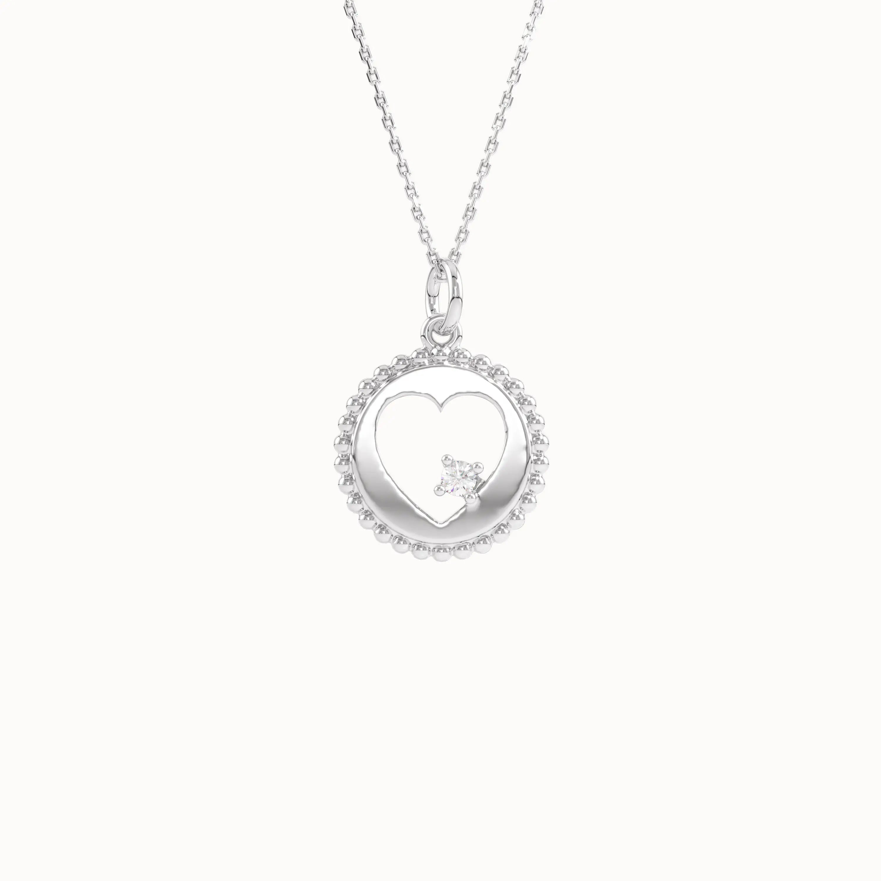This exquisite 14k solid gold pendant features a delicate circle design with a heart shape at its center, elegantly accented by a tiny lab diamond gemstone. This piece combines refined craftsmanship with subtle sparkle, making it a timeless addition to any jewelry collection.
