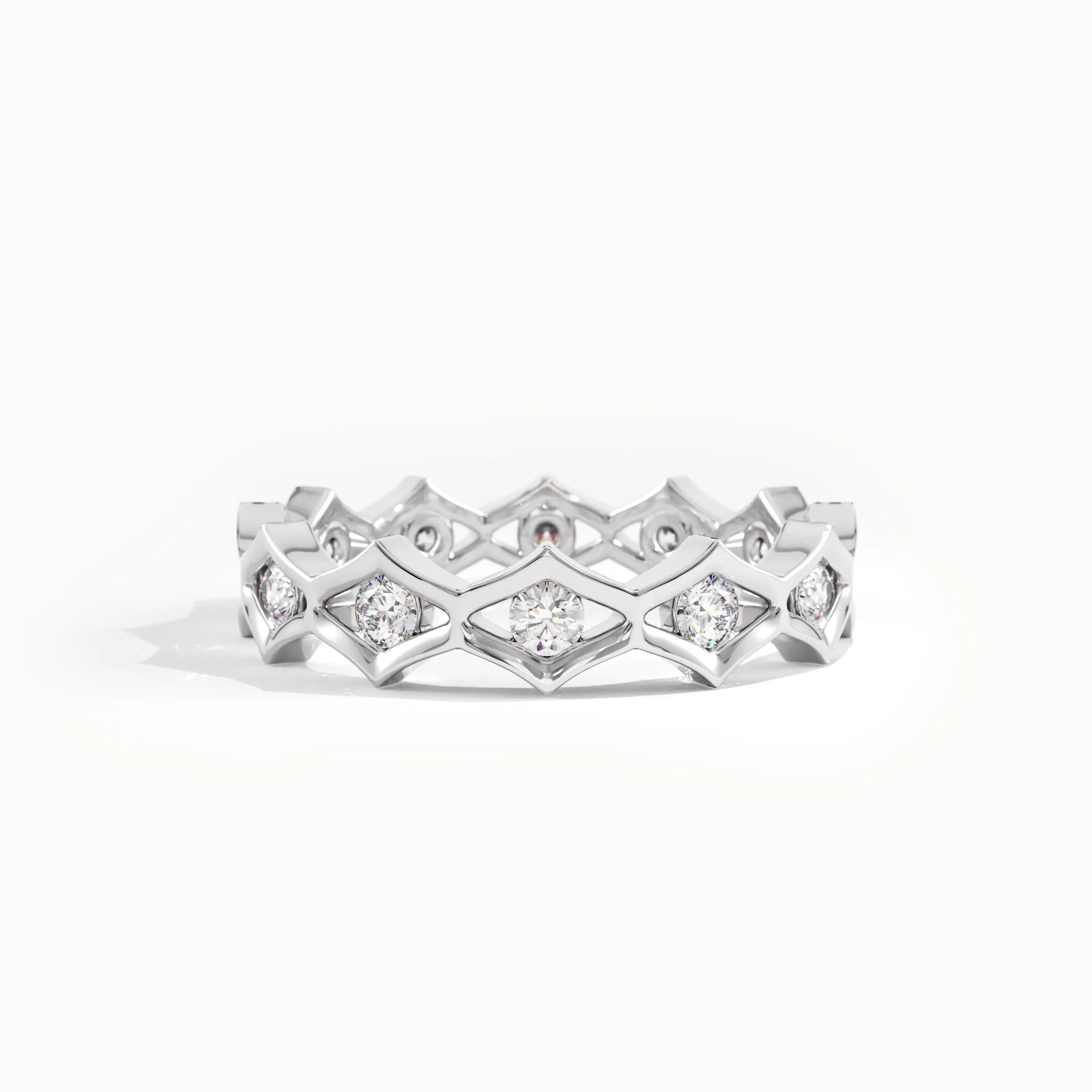 Crafted with a repeating geometric pattern, this eternity band delivers a bold and structured look with minimalist charm. Its modern form and continuous design make it an eye-catching statement piece for everyday wear or special occasions.