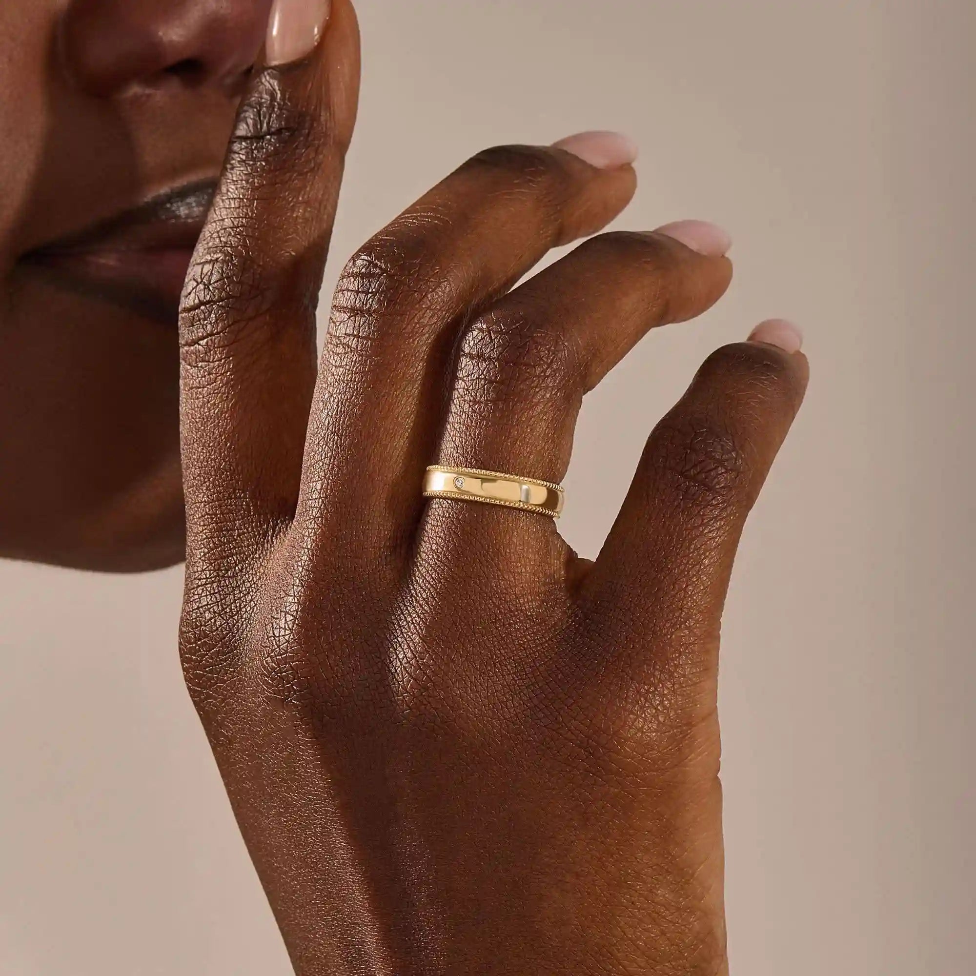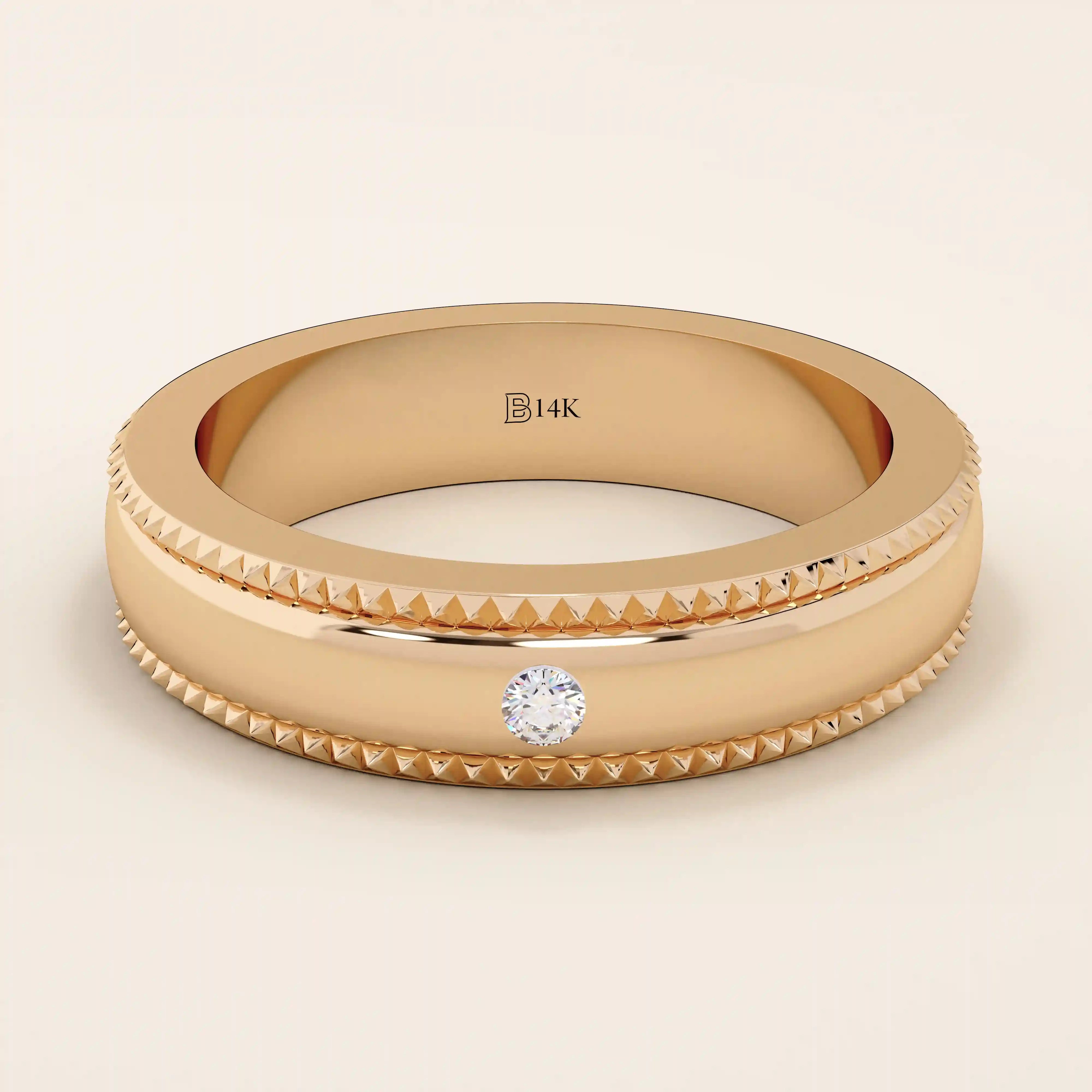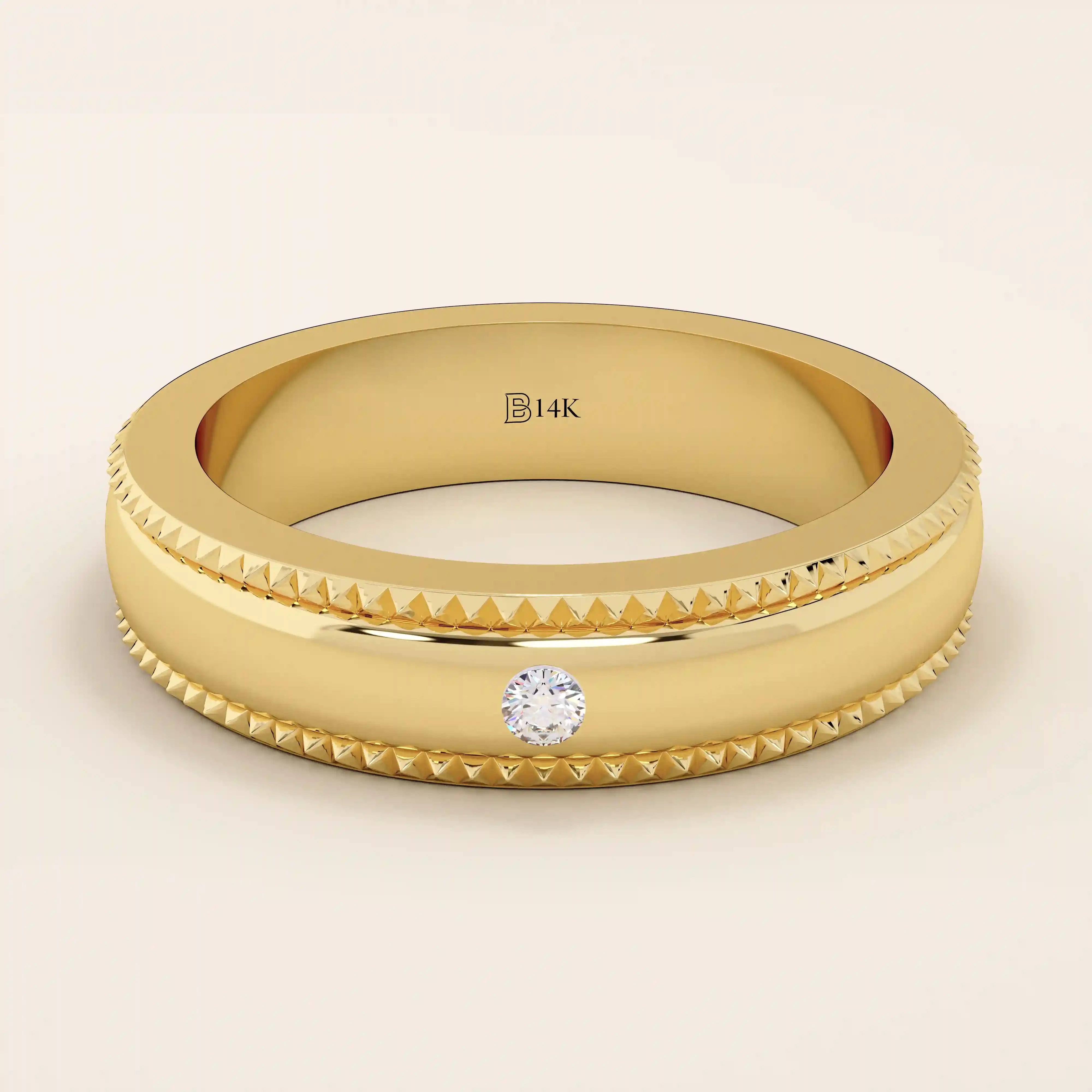 This 14k gold wedding band features a solo moissanite stone with delicate milgrain detailing. Perfect for adding a touch of sparkle to any wedding ensemble. Expertly crafted for a timeless and elegant look.