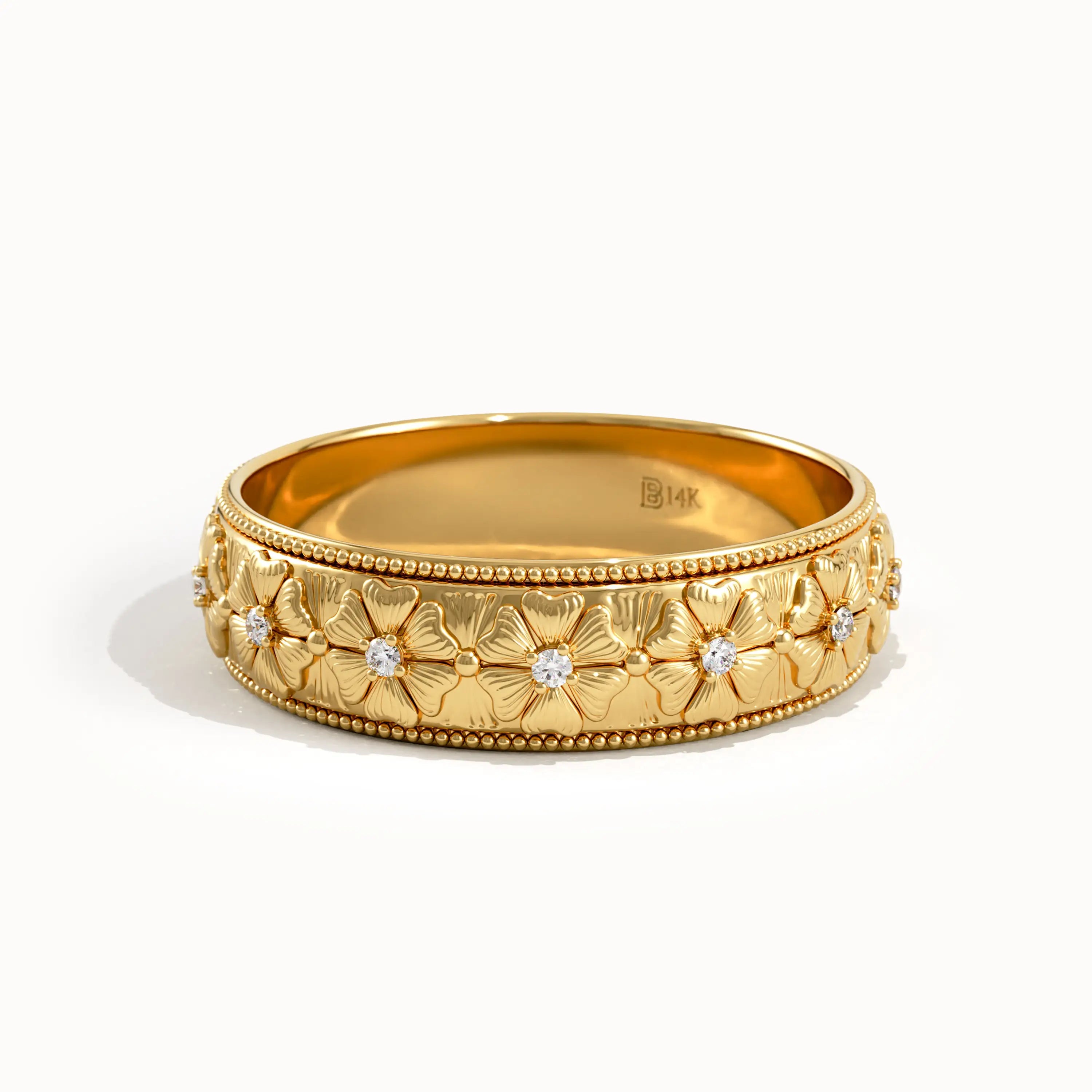 Crafted in solid gold, this wedding band is engraved with a delicate flower pattern that wraps softly around the finger. A romantic and timeless symbol, it’s ideal for nature lovers or anyone drawn to meaningful, organic details.