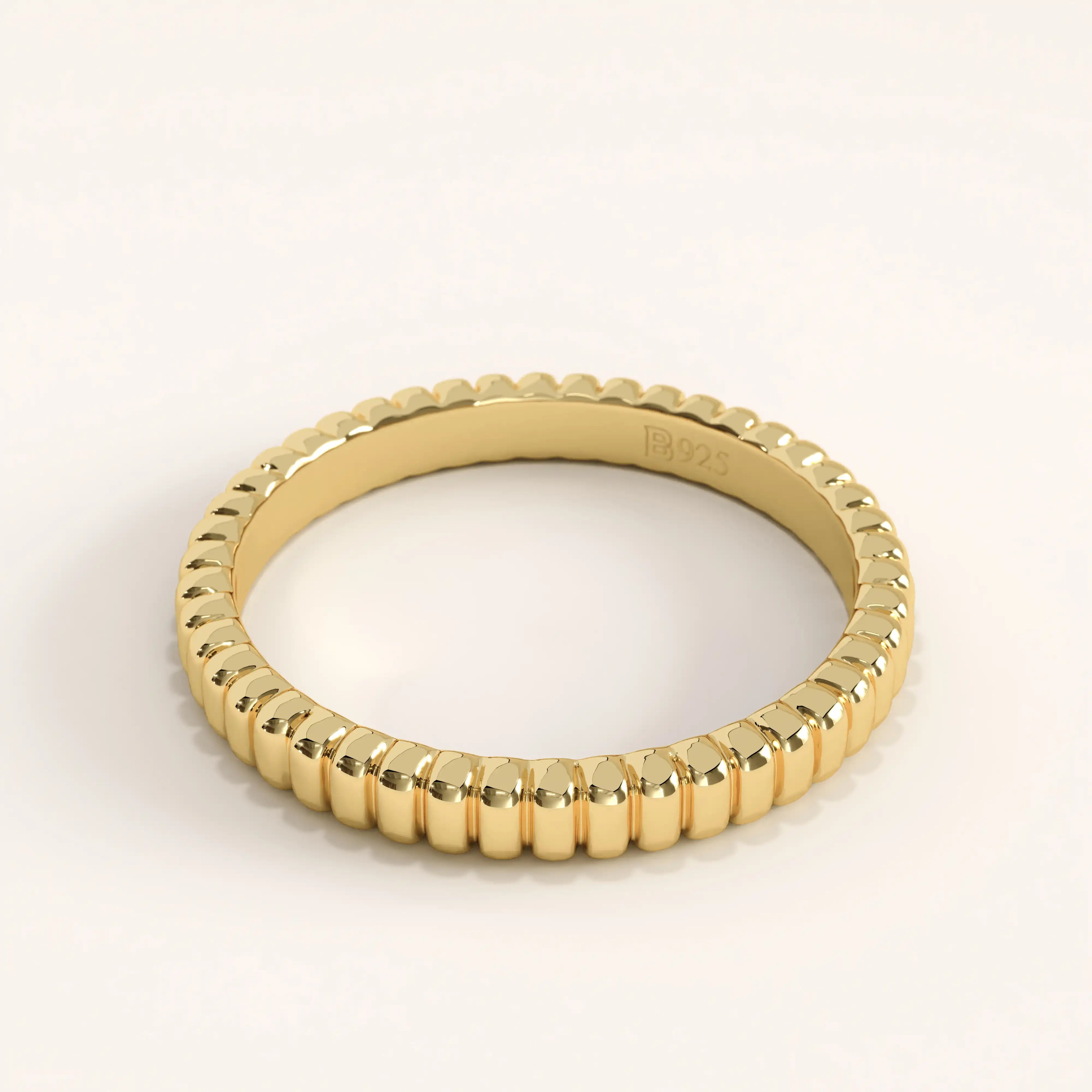 This 14k Gold Vermeil Minimalist Band Ring features a clean, structured pattern that adds depth without overpowering. Its polished finish and slim design make it perfect for everyday wear. Elegant when stacked or worn alone, this piece embodies simplicity, balance, and golden sophistication.