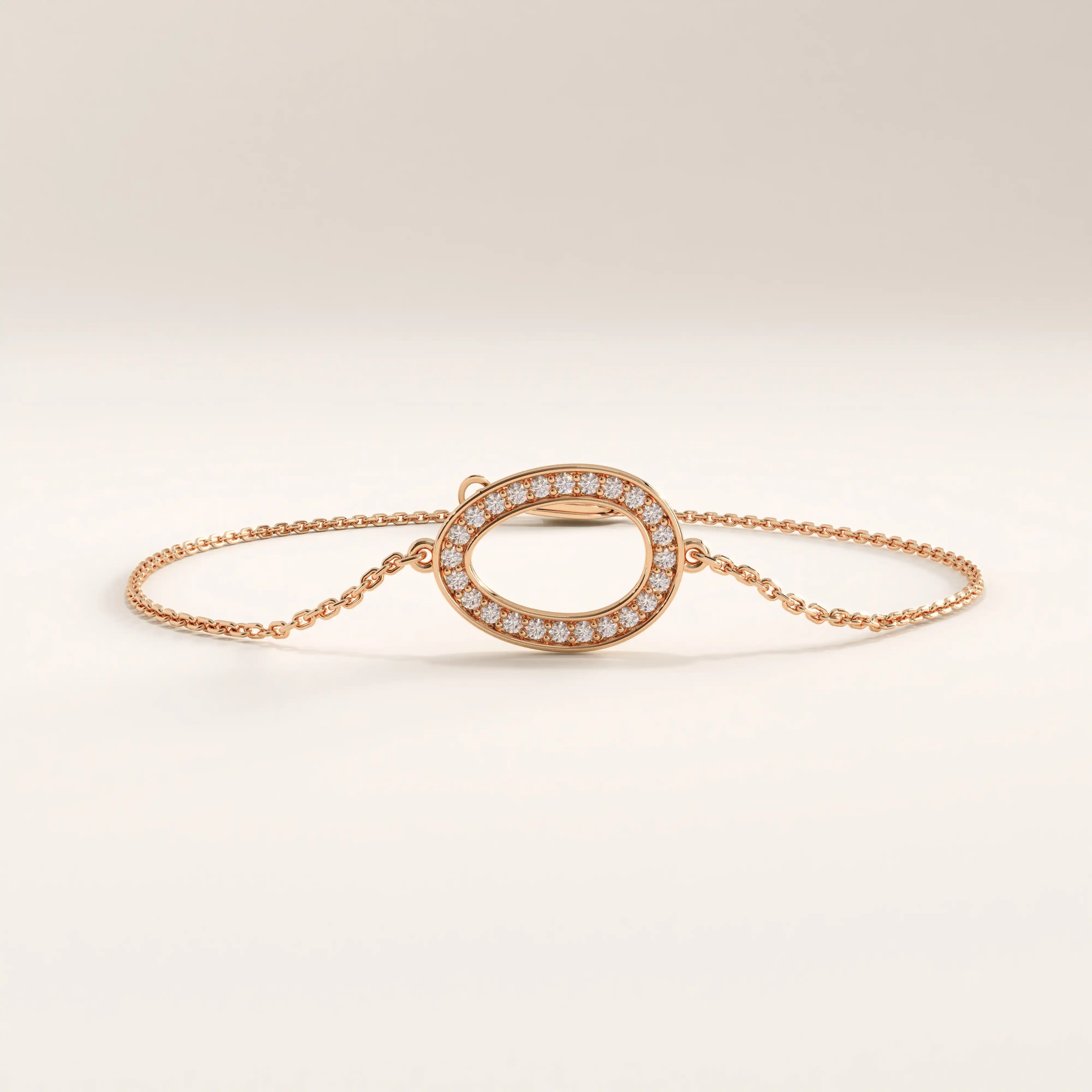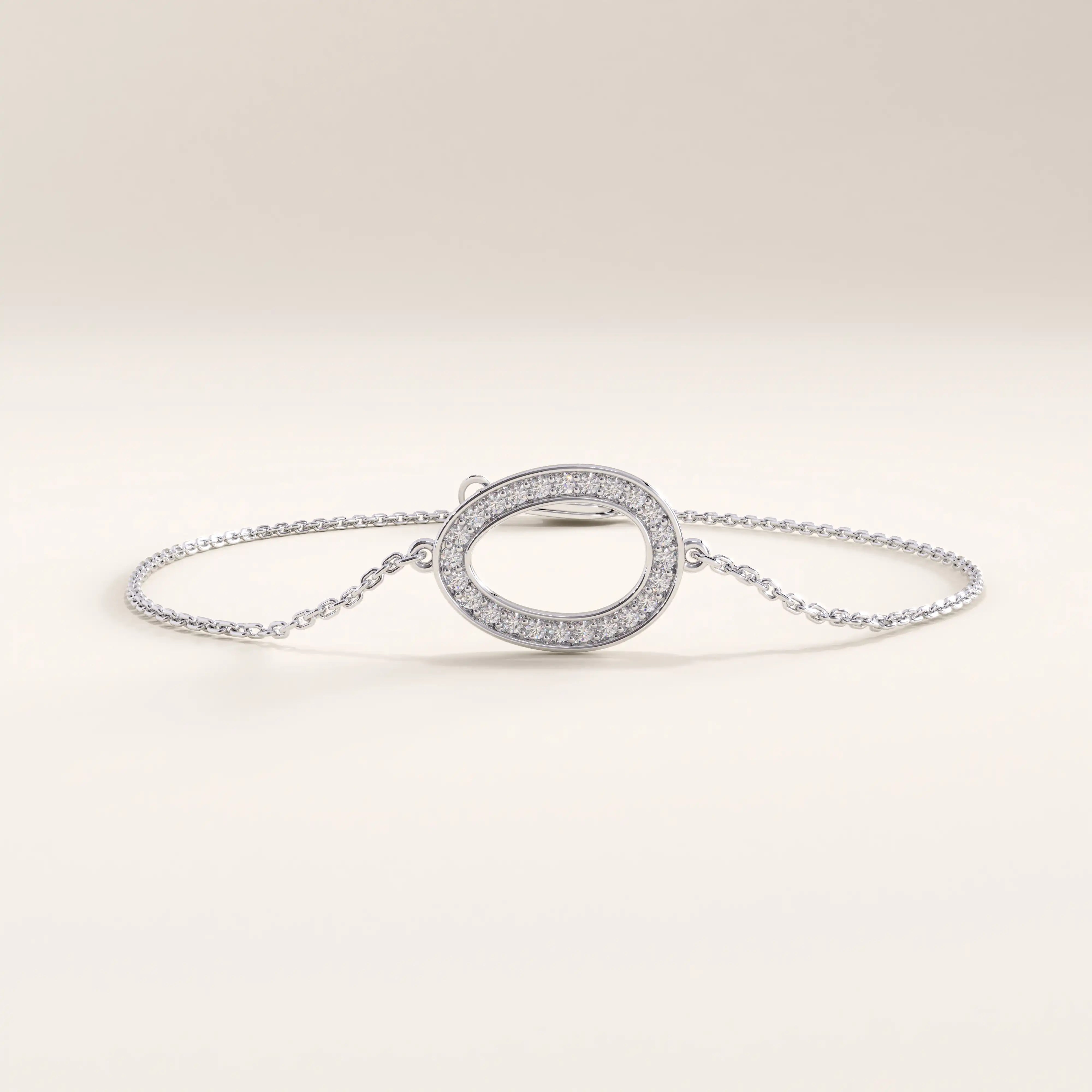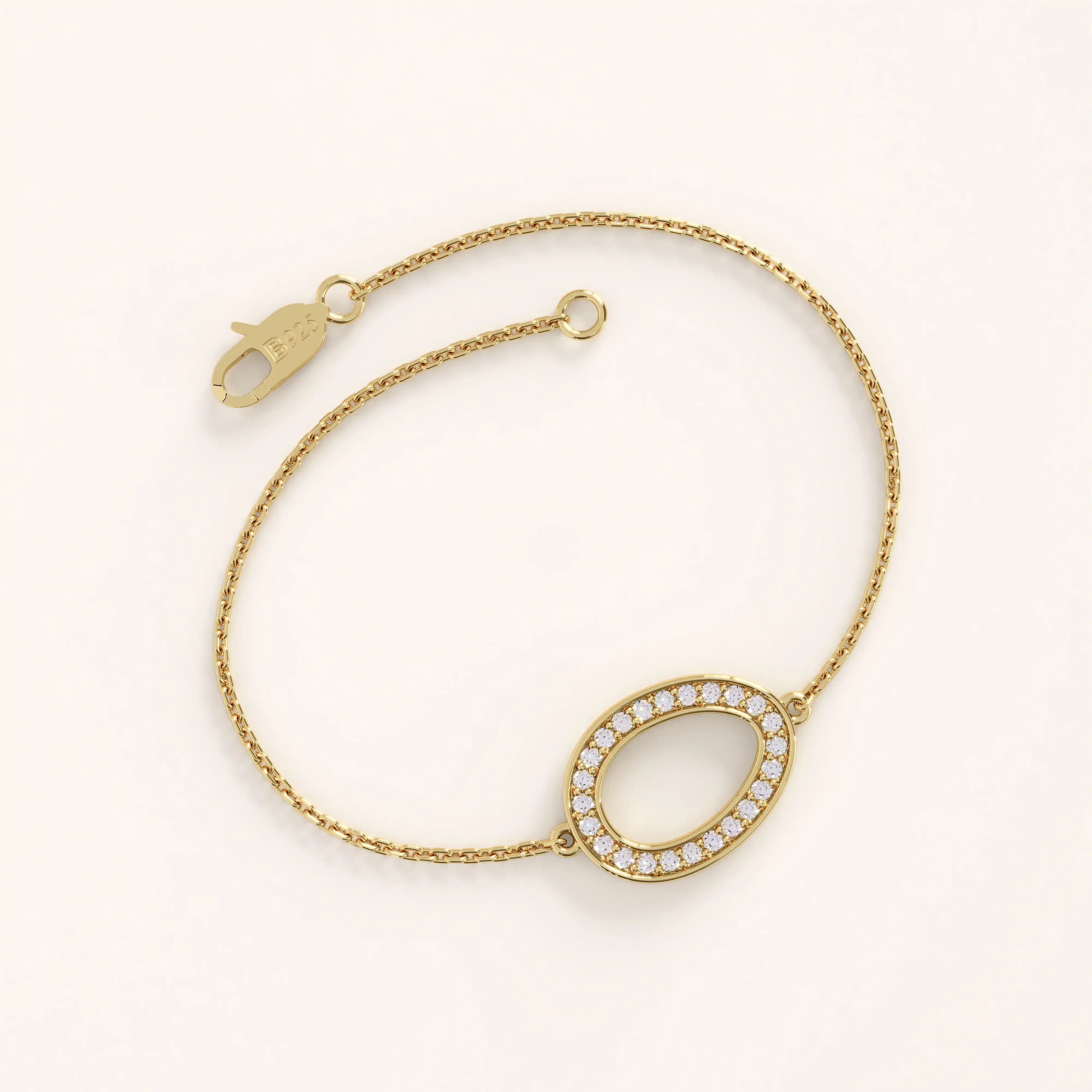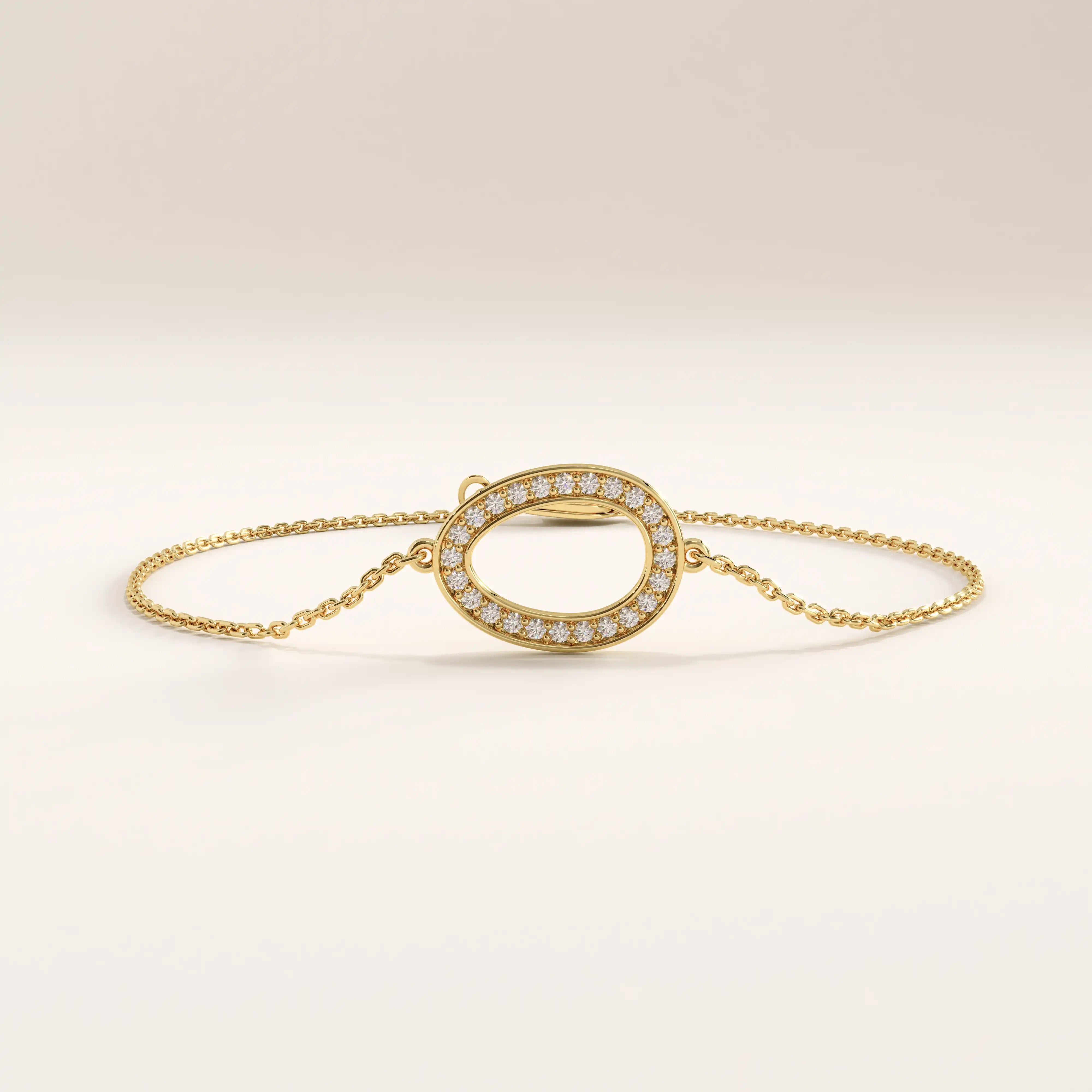 Crafted in 14k Gold Vermeil, this Oval Geometric Bracelet showcases a polished oval centerpiece outlined with pavé lab diamonds. The precise form and luminous finish create a sense of architectural grace. A sophisticated statement that merges artistry with timeless sparkle.