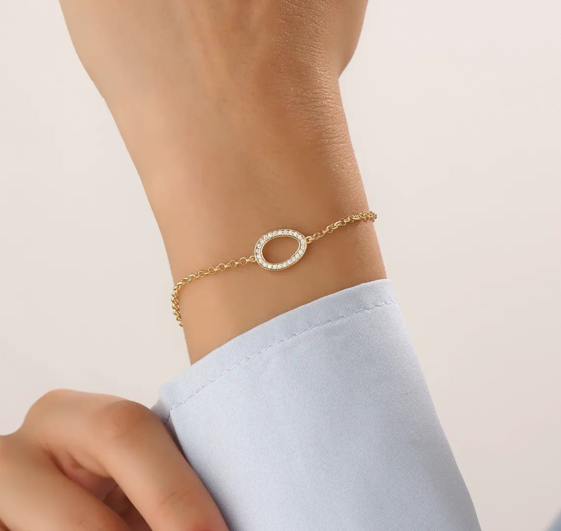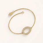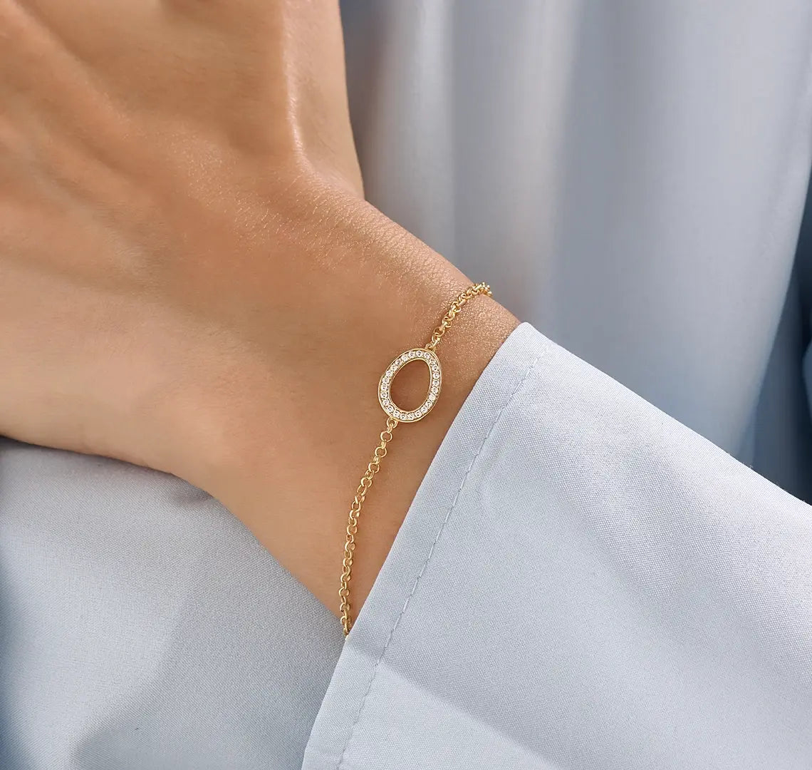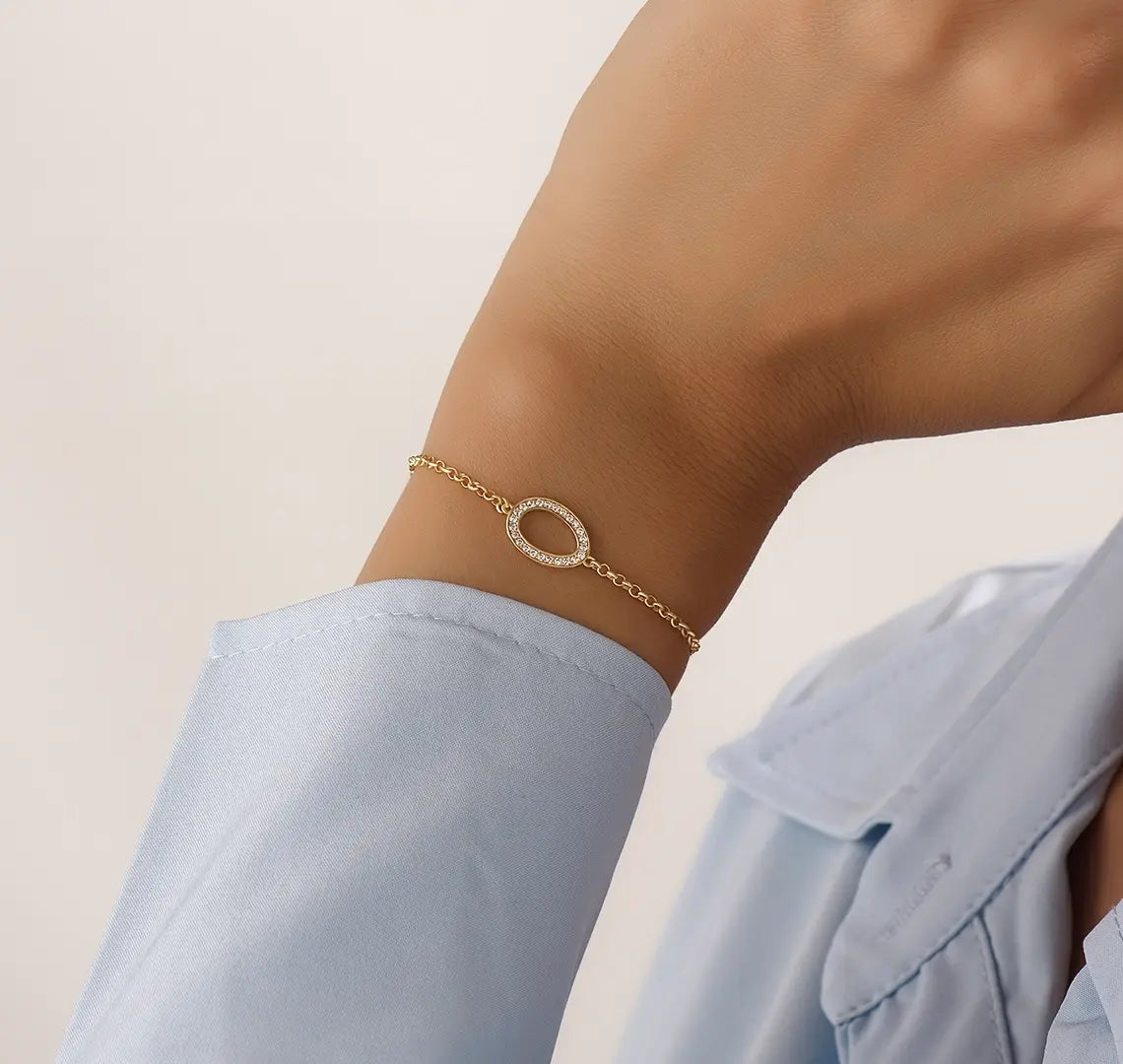 Crafted in 14k Gold Vermeil, this Oval Geometric Bracelet showcases a polished oval centerpiece outlined with pavé lab diamonds. The precise form and luminous finish create a sense of architectural grace. A sophisticated statement that merges artistry with timeless sparkle.