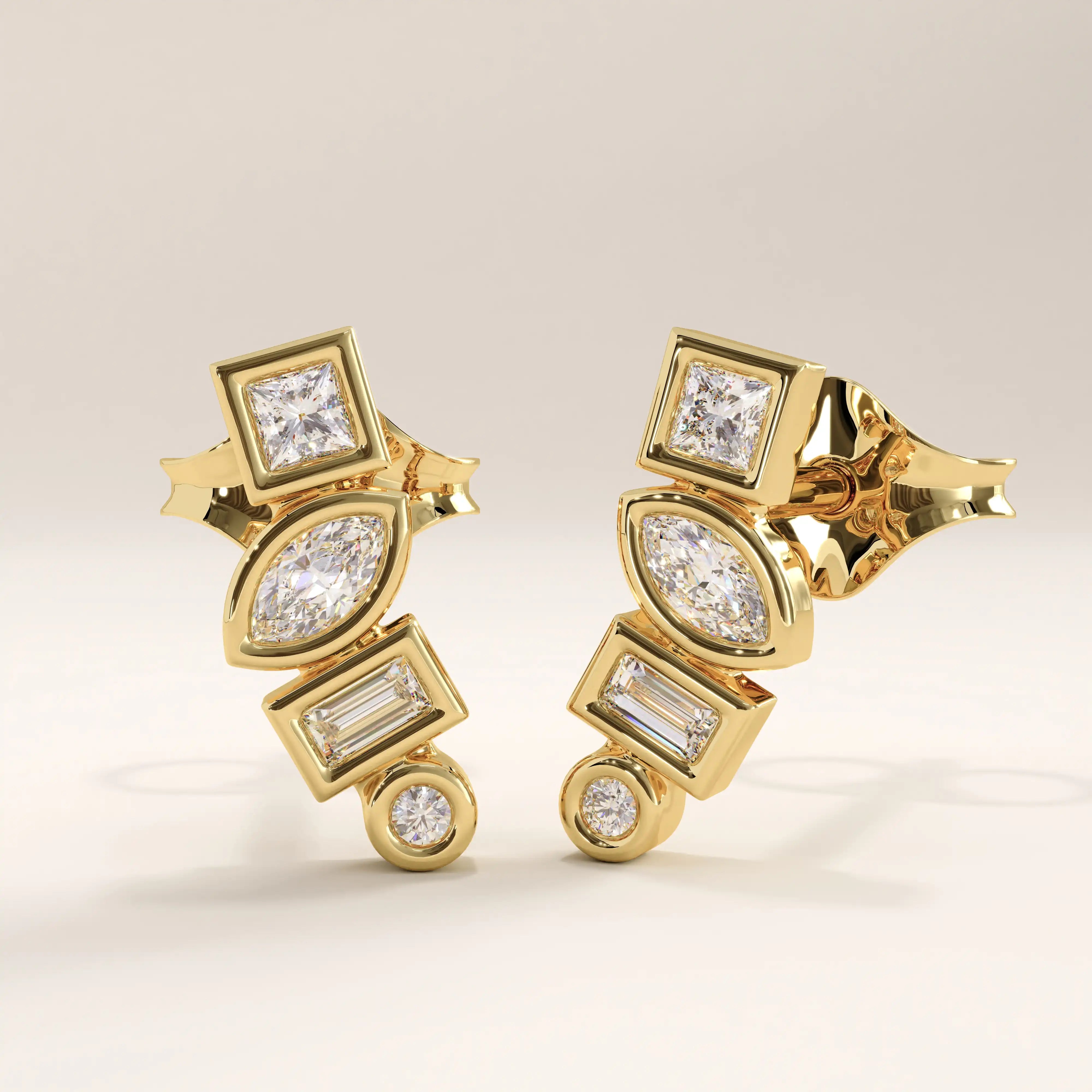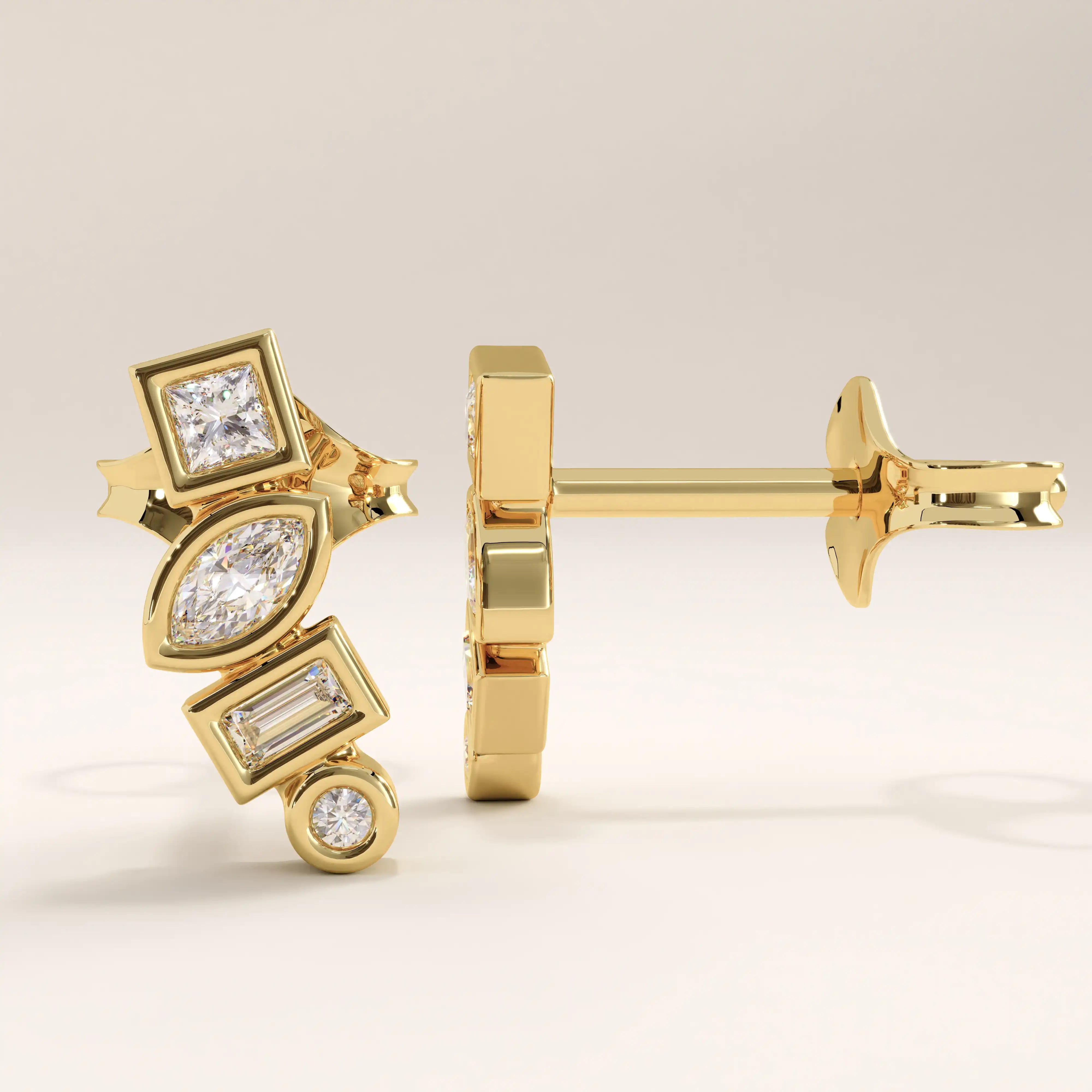 These Vermeil Gold Mixed Cut Bezel Set Stud Earrings feature a blend of round, princess, marquise and emerald-cut lab diamonds that create a subtle yet sophisticated sparkle. The bezel setting offers a sleek, modern finish while ensuring lasting shine. Perfect for everyday elegance or as a thoughtful, timeless gift.